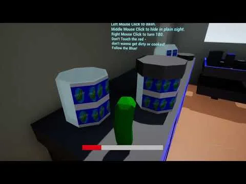 The first round of feedback was given and the idea of having a roaming AI as a threat to the player and having the ability to flop over to hide in plain sight was conceptualized. The next week was working in said mechanic and making a Block Mesh of the level complete with a beginning and ending Sequence. When the Middle Mouse Button is being held, physics are added to the Pickle Static Mesh and Player movement is frozen. The player can still look around to track the pickle and the AI. When released, the Player will re-attach to wherever the Pickle Static Mesh resides.